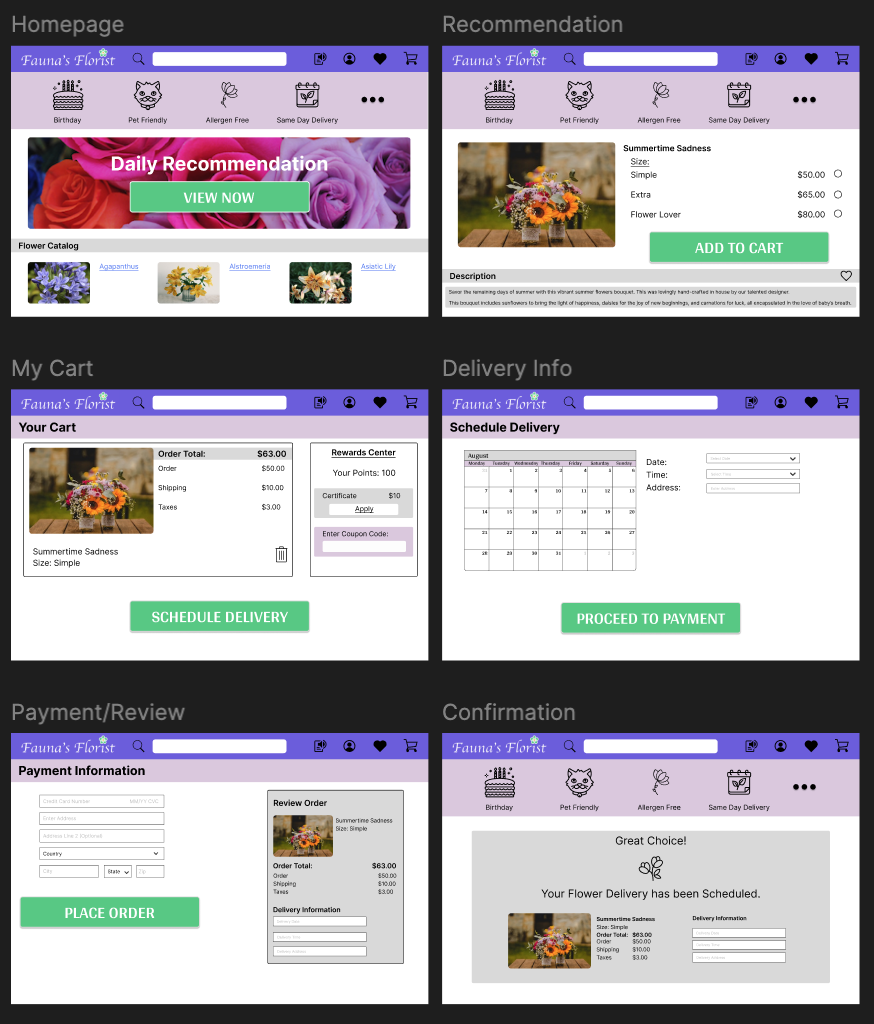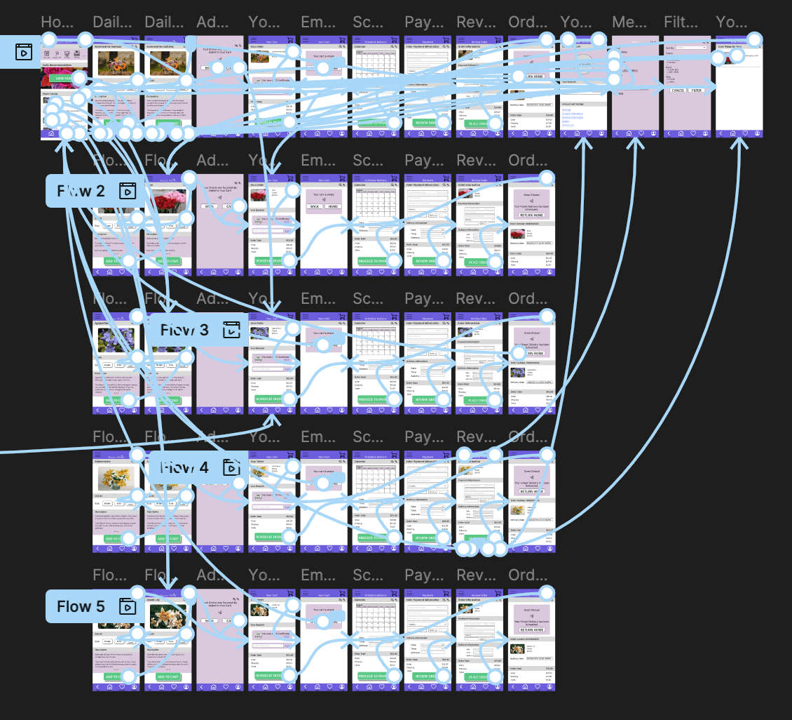The high-fidelity prototype focuses on creating a simple user flow to order flowers and schedule a delivery.